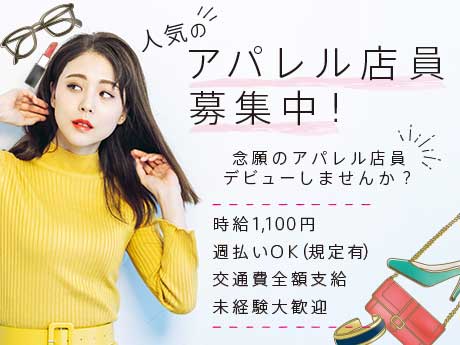【お仕事内容】 アパレルショップ内での ◆接客・販売 ◆品出し ◆清掃 などのお仕事をお任せします。 【勤務形態】 ◆勤務パターン 1)10:00~19:00 2)11:00~20:00 (内休憩1時間・8時間勤務) ◆土日祝を含めた月16日間勤務 (土日勤務必須)